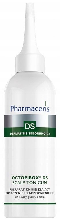 Pharmaceris DS OCTOPIROX DS SCALP TONICUM izdelek za zmanjševanje luščenja in rdečice lasišča in telesa 100 ml. Ta izdelek zagotavlja takojšnje olajšanje. Hitro pomirja srbenje, pekoč občutek, luščenje, rdečico in prekomerno seborejo (simptome seboroičnega dermatitisa). Zasnovan je za preprečevanje ponovitve simptomov, povezanih s seboroičnim dermatitisom. Učinkovito zmanjšuje prekomerno nastajanje sebuma, s čimer zmanjšuje mastnost lasišča in telesa. Zmanjšuje neestetično luščenje in vidno rdečico kože. Preprečuje izpadanje las, ki ga povzroča seboroični dermatitis. Namen uporabe: Ta izdelek je namenjen vsakodnevni dermonegi lasišča in telesa s simptomi seboroičnega dermatitisa. Indiciran je v primerih prekomernega nastajanja sebuma, vztrajnega srbenja, luščenja in rdečice povrhnjice. Primeren za uporabo pri osebah, starih 12 let in več. Sestavine: voda (Aqua), denaturiran alkohol, butilen glikol, hidrogenirano ricinusovo olje PEG-40, kaprilni/kaprinski gliceridi PEG-6, izvleček plodov pomaranče (Citrus Aurantium Dulcis), inulin, citronska kislina, pirokton olamin, glicerin, alfa-glukan oligosaharid, cinkov PCA, izvleček korenine pomaranče (Arctium Lappa), biotin, natrijev benzoat, kalijev sorbat. Sestava je približna. Trenutna številka INCI je vedno na voljo na spletni strani proizvajalca. Navodila za uporabo: Za vsakodnevno uporabo zjutraj in/ali zvečer na prizadetih predelih lasišča in telesa. Za poraščeno lasišče razrežite celotno lasišče in nanesite izdelek na vsak del, nato pa vmasirajte v kožo. Izdelka ni treba izpirati. Embalaža: 100 ml