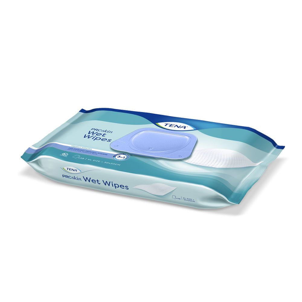 Vlažni robčki Tena ProSkin so velikosti 30 × 20 cm, ki čistijo, ščitijo in vlažijo tudi najobčutljivejšo kožo. Ti veliki robčki za vsakodnevno uporabo so idealni za intimne predele pri menjavi izdelkov za inkontinenco ali za umivanje celega telesa.