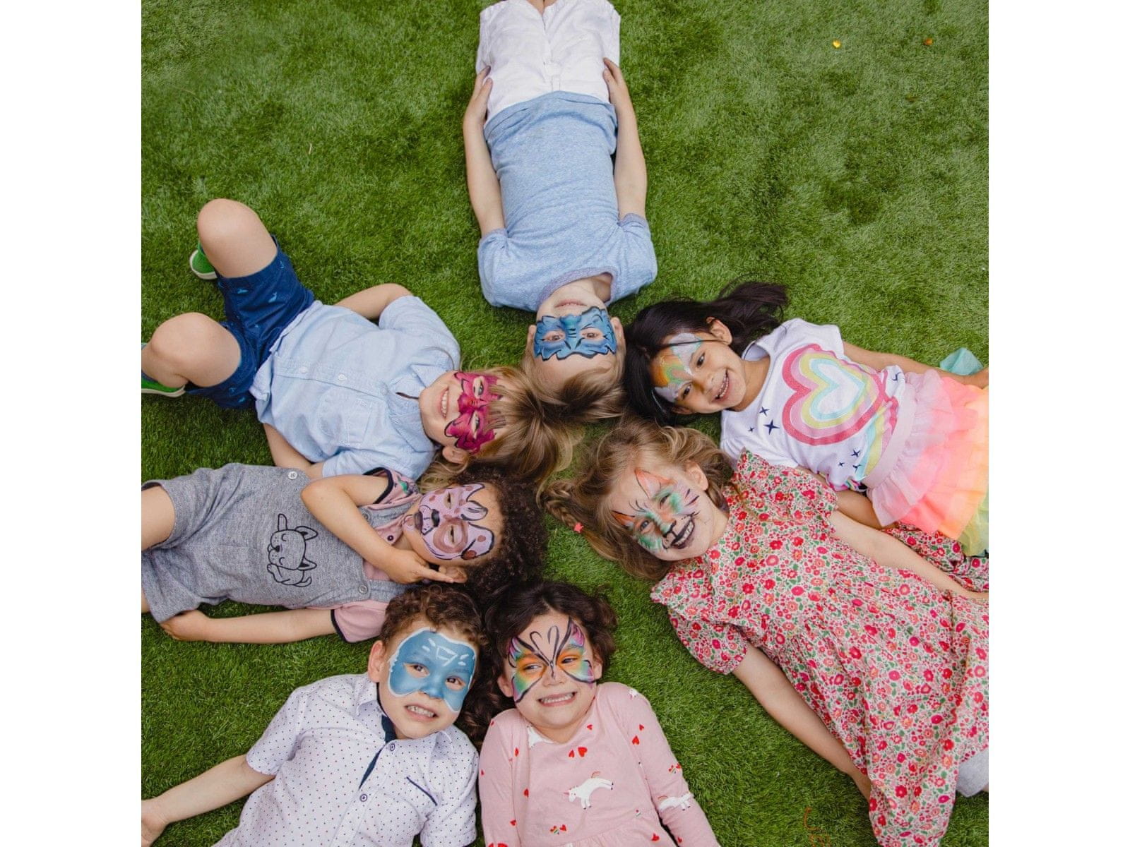 Komplet vsebuje 6 barv (modra, vijolična, črna, rožnata, zelena, bela) v ločenih posodah, mehko gobico, aplikator in čopič – vse, kar potrebujete za varno barvanje obraza in telesa.