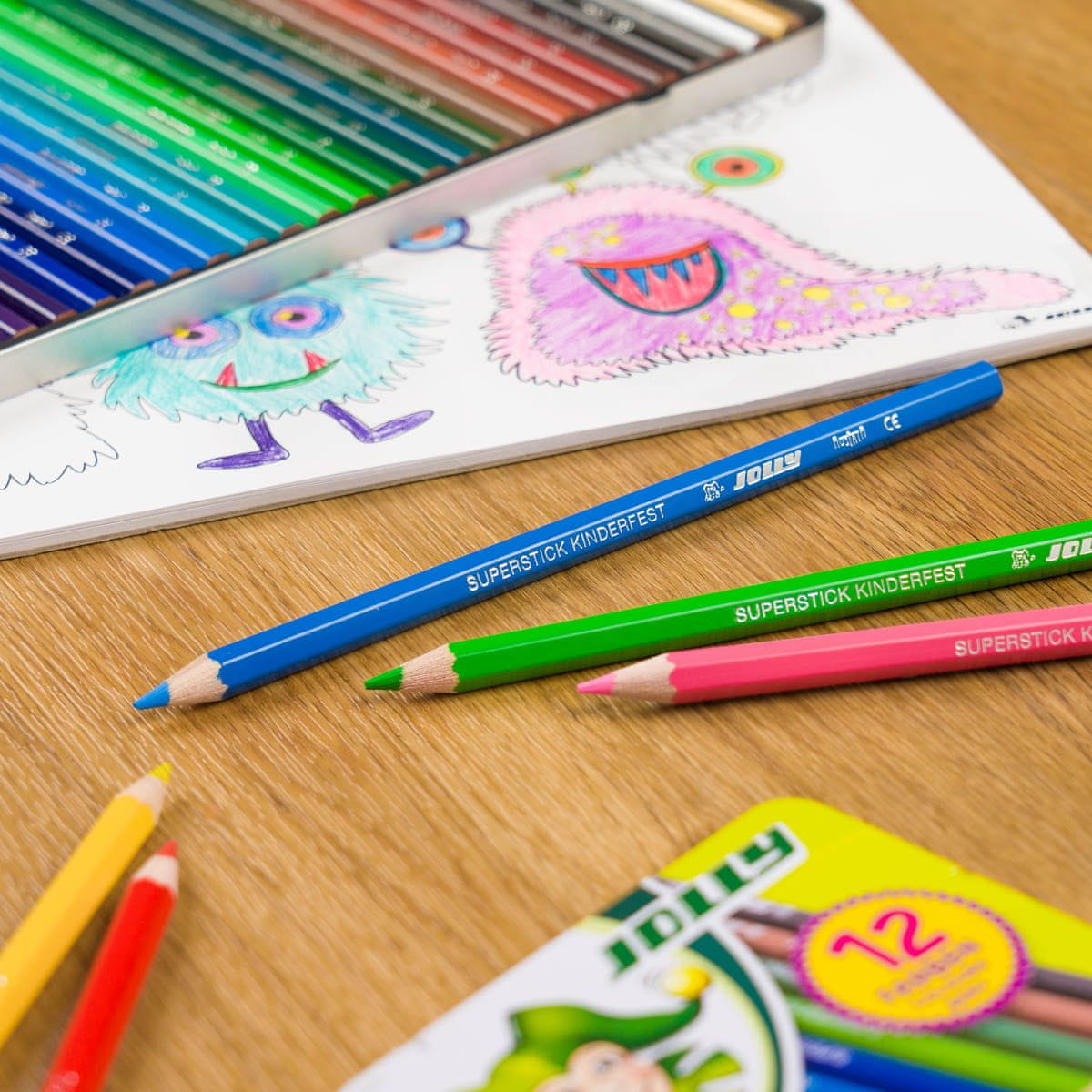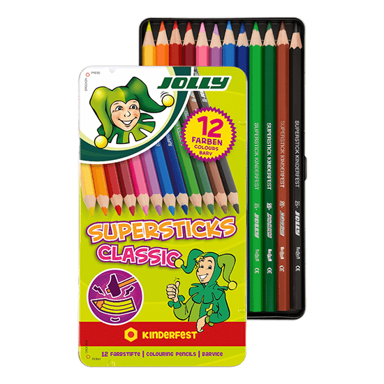 Supersticks Kinderfest so preizkušene barvice Jolly. Zaradi živih barv, izjemno močnega lesenega trupa in temeljito preizkušene mine Jolly so naše barvice Supersticks že več generacij najbolj priljubljene barvice za barvanje in risanje.