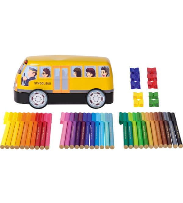 Otroški darilni komplet, ki vsebuje 33 barvitih konektorjev Faber-Castell in 10 konektorjev, pakiranih v embalaži v obliki šolskega avtobusa, ki se lahko uporablja tudi kot igrača