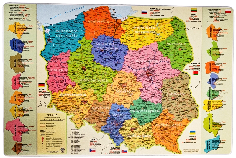 Natisnjen zemljevid s podrobno upravno delitvijo Poljske, zemljevid vključuje najpomembnejše informacije, kot so: površina Poljske, površina kopnega, dolžina obal itd. glede vojvodstev, npr. glavno mesto vojvodstva, število okrožij, število občin, površina v km2. Podloga je zaščitena z visokokakovostno folijo z nedrsečo podlago, odporno na odrgnine, prah, vodo in vlago. Uporablja se lahko kot podloga za namizno mizo, miško, prenosni računalnik itd.