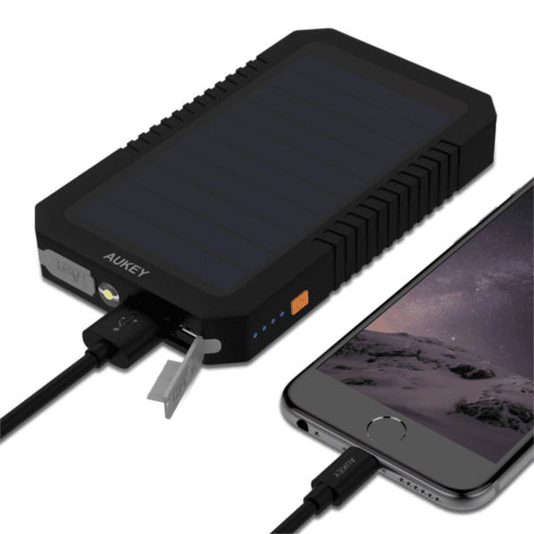 Aukey 12000mAh Solar Power Bank je prenosna baterija s kapaciteto 12000mAh. Nudi tako možnost polnjenja preko sončnih celic kot tudi micro-USB adapterja. Združljiva je z vsemi pametnimi telefoni in ima dva napajalna USB izhoda s tokovoma 1A in 2.4A, oba pri 5V.