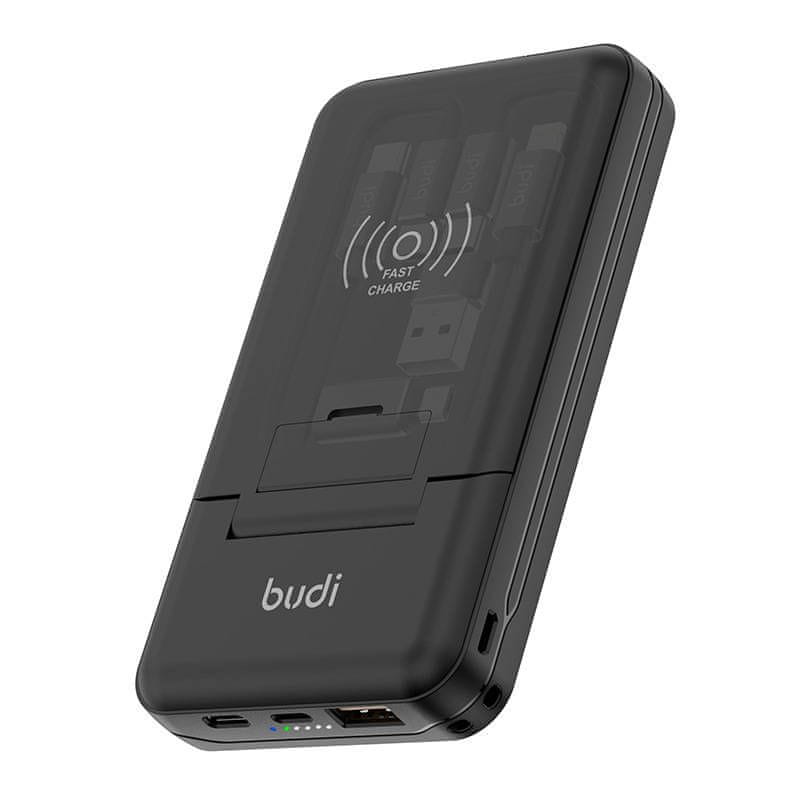 Budi 515Q je več kot le powerbank. Izdelek odlikuje premišljena zasnova in je opremljen s posebnim stojalom, na katerega lahko naslonite svoj pametni telefon za udobno polnjenje in gledanje filmov ali video klicev. Poleg tega powerbank deluje tudi kot prostor za shranjevanje kablov in adapterjev. Komplet vključuje ključ za odstranjevanje kartice TF/SIM, adapterje: USB-C na micro USB, USB-A na USB-C ter kabla: USB-C na Lightning in USB-C na USB-C.