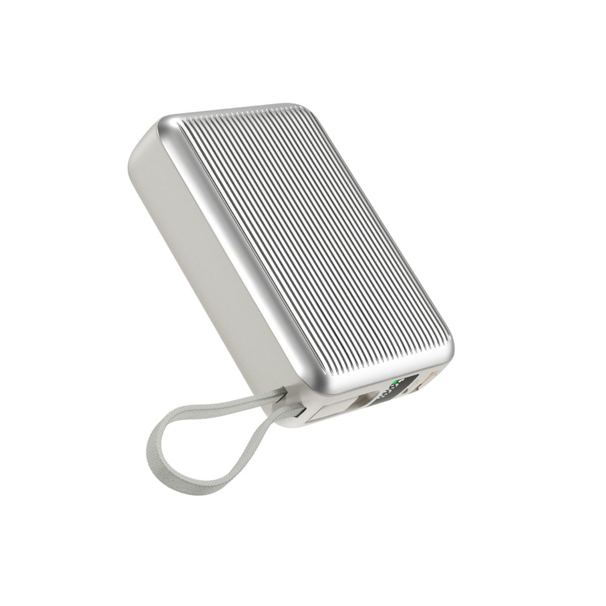 Baterija omogoča sočasno polnjenje do treh naprav prek integriranega kabla USB-C, dodatnega vhoda USB-C in vhoda USB-A. Integriran pleten kabel podpira dvosmerno polnjenje in hkrati služi kot trpežna zanka za lažje prenašanje. Elegantno ohišje vključuje jasen digitalni zaslon, s katerim imate vedno pregled nad preostalo energijo.
