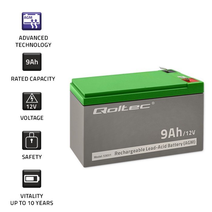 Qoltec baterija agm | 12 V | 9 Ah | brez vzdrževanja | učinkovita| z dolgo življenjsko dobo | za ups, varnost