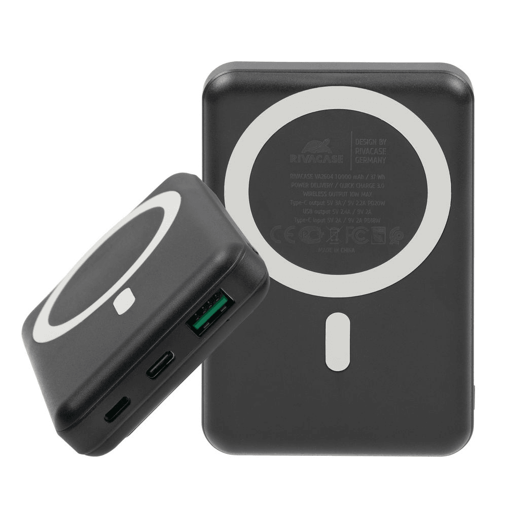 RIVACASE VA2604 je prenosna baterija s kapaciteto 10.000 mAh in močjo 20W, ki omogoča hitro brezžično polnjenje. Z Magsafe magnetno poravnavo je združljiva z najnovejšimi iPhone modeli, vključuje LED indikator in zaščito pred prekomernim polnjenjem. Vgrajeno zložljivo stojalo omogoča udobno uporabo Celoten opis