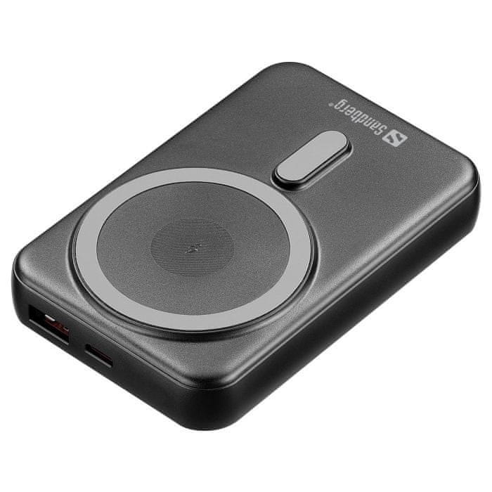 Prenosna baterija Sandberg Magnet Wireless Powerbank 10000 mAh je zelo pametna prenosna baterija z naborom funkcij polnjenja. Pametne telefone, skladne s standardom Qi lahko polnite popolnoma brezžično, ko telefon položite na polnilni podstavek na prenosni bateriji. Polnilna plošča je magnetna, zato lahko nanjo namestite tudi telefone iPhone, ki podpirajo funkcijo MagSafe. Opremljena je tudi z izhodom USB-C za hitro polnjenje naprav vse do 22,5 W in izhodom USB-A z 10 W. Pametni LCD zaslon prikazuje status baterije.