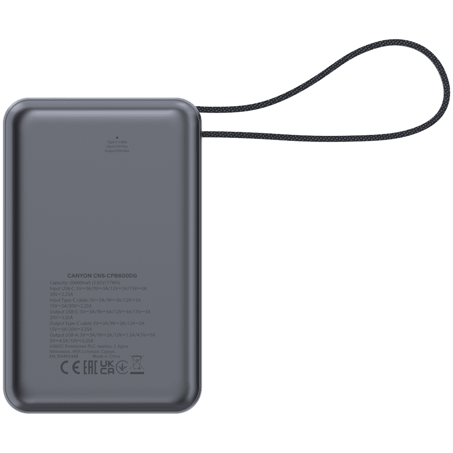 CANYON OnPower 600 do nowoczesny , mocny in uniwersalny Powerbank zaprojektowany dla osób, które 20.000 mAh baterija, izjemno zmogljiva moč 65 W, brezžični kabel, pametni LCD zaslon in kompaktna, kompaktna baterija, idealna za vsakodnevno uporabo.