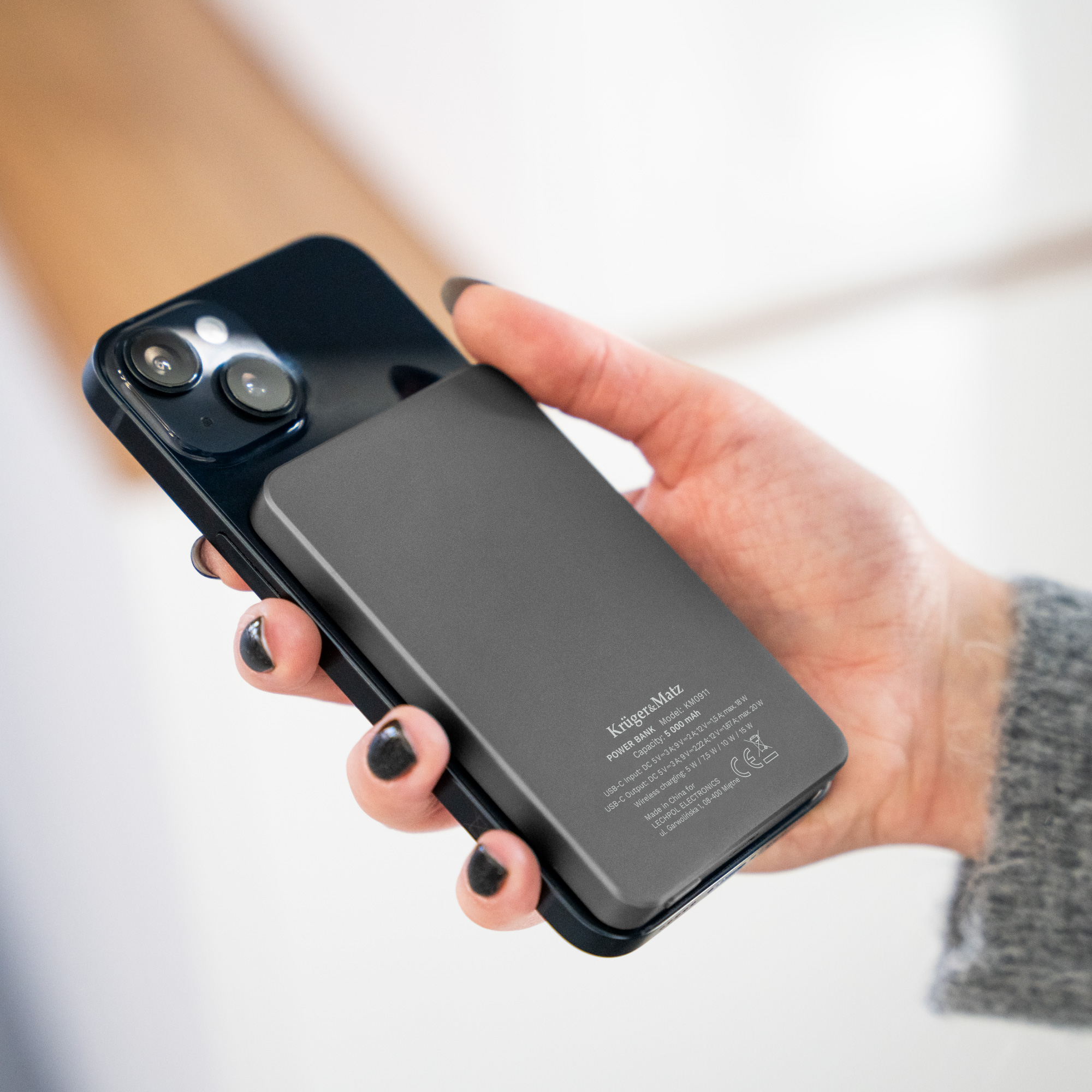 Zahvaljujoč združljivosti s tehnologijo MagSafe, Kruger&Matz KM0911 Power Bank ponuja izjemno priročnost polnjenja. Magnetni nosilec omogoča natančno poravnavo naprave s polnilnikom, kar odpravlja težave pri odklopu ali premikanju pametnega telefona med polnjenjem. Trden nosilec vam omogoča brezskrbno uporabo telefona tudi na poti.