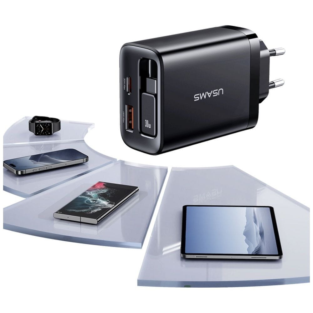 shumee Polnilnik za steno USAMS Xiang serije CC296 30W 1xUSB-C 1xUSB-A + kabel USB-C črne barve