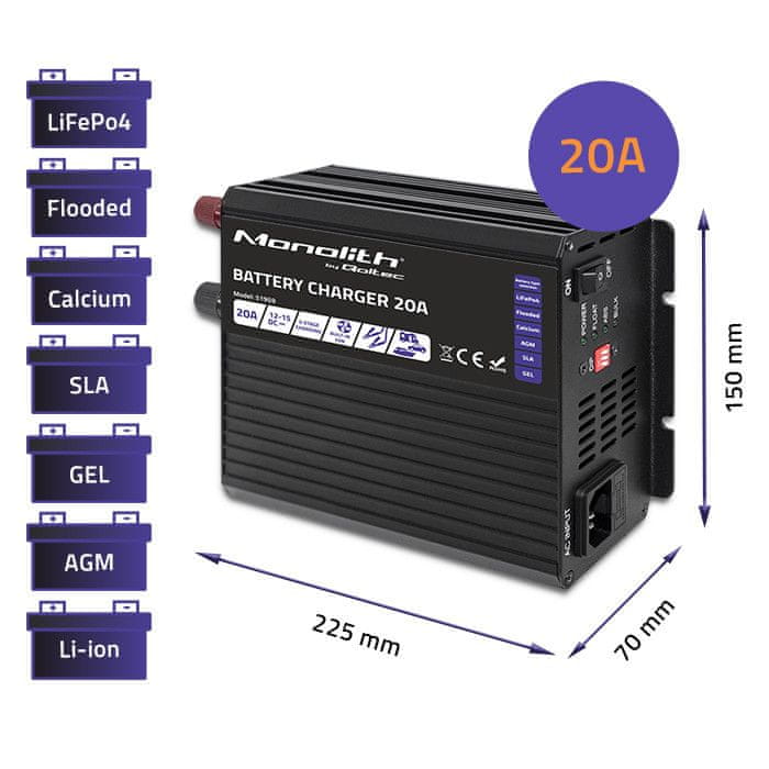 shumee Qoltec Inteligentni Monolith Polnilnik za LiFePO4 AGM GEL SLA baterije | 20A | 12V