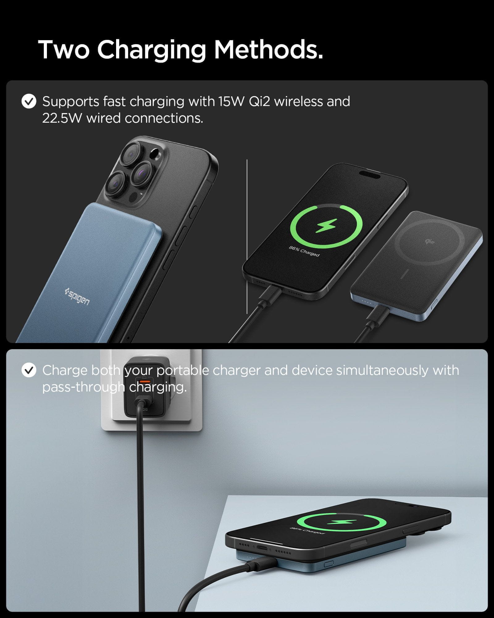 Kompaktna moč v tankem ohišju. Zmogljiva brezžična prenosna baterija Spigen MagSafe 5000mAh ponuja hitro polnjenje do 15 W s certifikatom Qi2 in močnim magnetnim nosilcem za varno povezavo z MagSafe iPhoneom. Idealen dodatek za vsakodnevno uporabo zaradi tankega 12 mm profila in aluminijastega ohišja za učinkovito odvajanje toplote.
