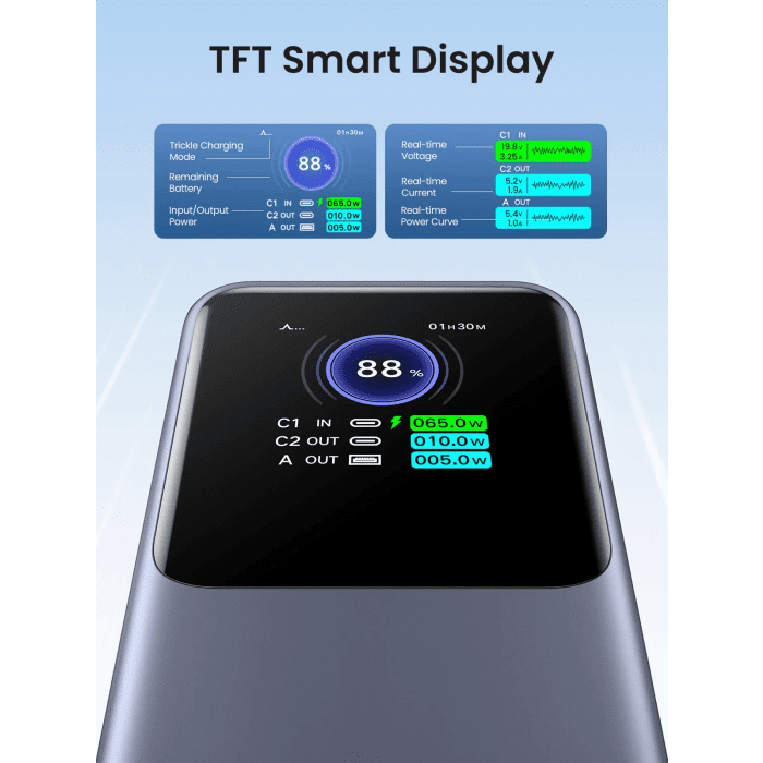 Zagotovite si pametnejšo izkušnjo polnjenja prek vrhunskega digitalnega zaslona, ki prikazuje preostalo baterijo, napetost v realnem času, tok v realnem času, vhodno moč in izhodno moč. Hitro in intuitivno lahko razumete stanje napolnjenosti različnih naprav.