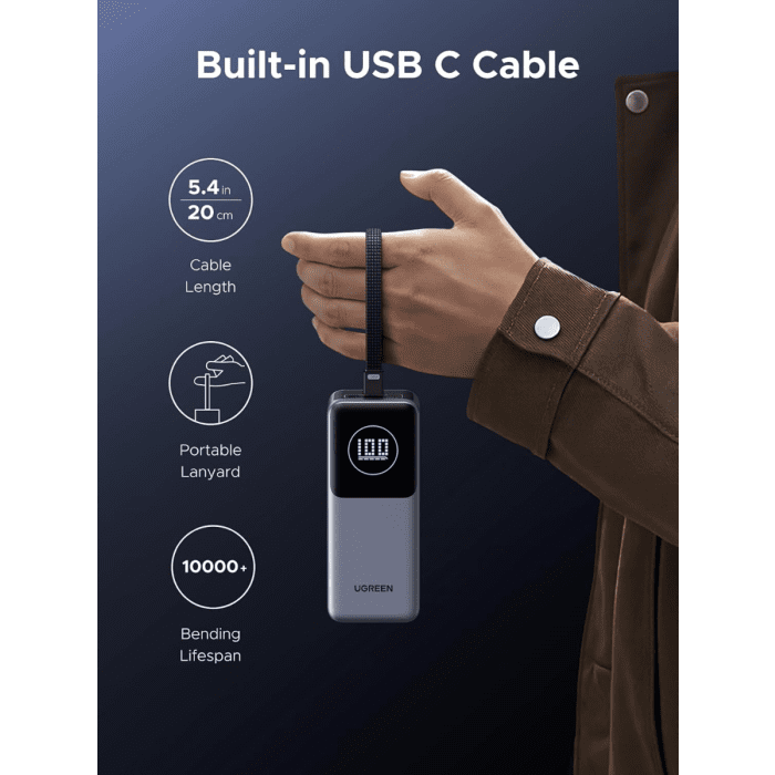 UGREEN 55365B je zmogljiv power bank s kapaciteto 20.000 mAh in skupno izhodno močjo do 130 W. Opremljen je z vgrajenim USB-C kablom ter dodatnima priključkoma USB-C in USB-A, kar omogoča hitro polnjenje prenosnikov, tablic in pametnih telefonov, kjerkoli ste.