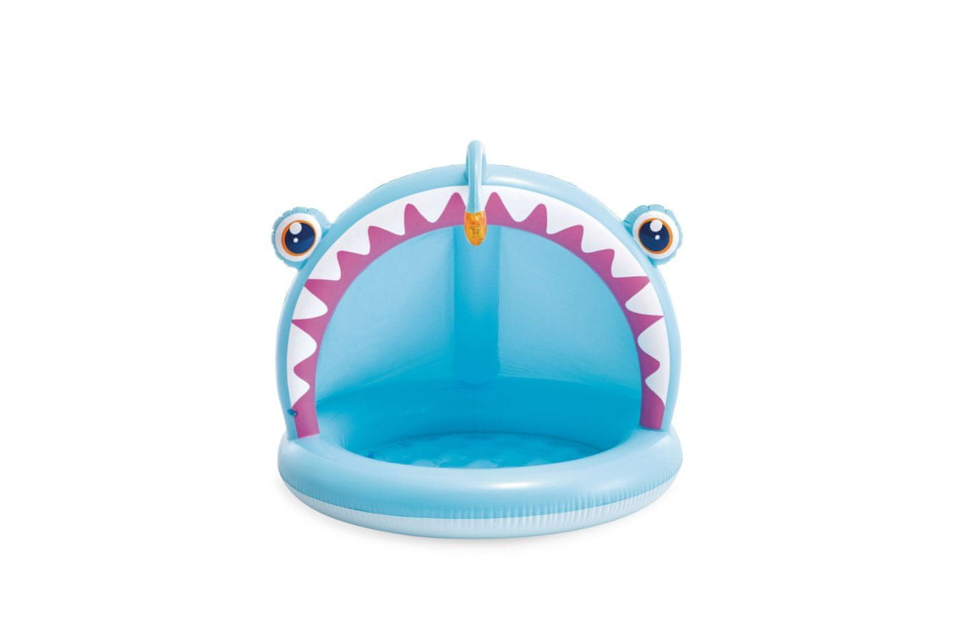 Napihljiv otroški bazen z delnim senčnikom za otroke od 1 do 3 let. Bazen z mehkim napihljivim dnom ima obliko ribe. Dimenzije 127 cm x 102 cm x 86 cm.