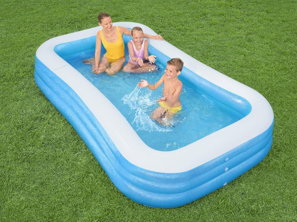 Se morate včasih ohladiti na vroč dan in nimate časa na mestno kopališče ali na vodo? Zato predstavljam ta senzacionalni napihljiv družinski bazen, namenjen sprostitvi v vročih dneh za vso družino. Zelo hitro ga lahko razgrnete, napolnite z vodo in relax je pripravljen. Velik, napihljiv bazen z dimenzijami 305 cm x 183 cm x 56 cm bo sprejel vse tiste, ki potrebujejo osvežitev. Bazen je sestavljen iz treh napihljivih obročev, ki mu dajejo vzdržljivost. Fantastična modro-bela barva vas spodbuja k igri v njem. Izdelek je izdelan iz močnega PVC-ja, kar bo zagotovilo njegovo dolgotrajno uporabo, zato ste lahko prepričani, da bo nakup več let.