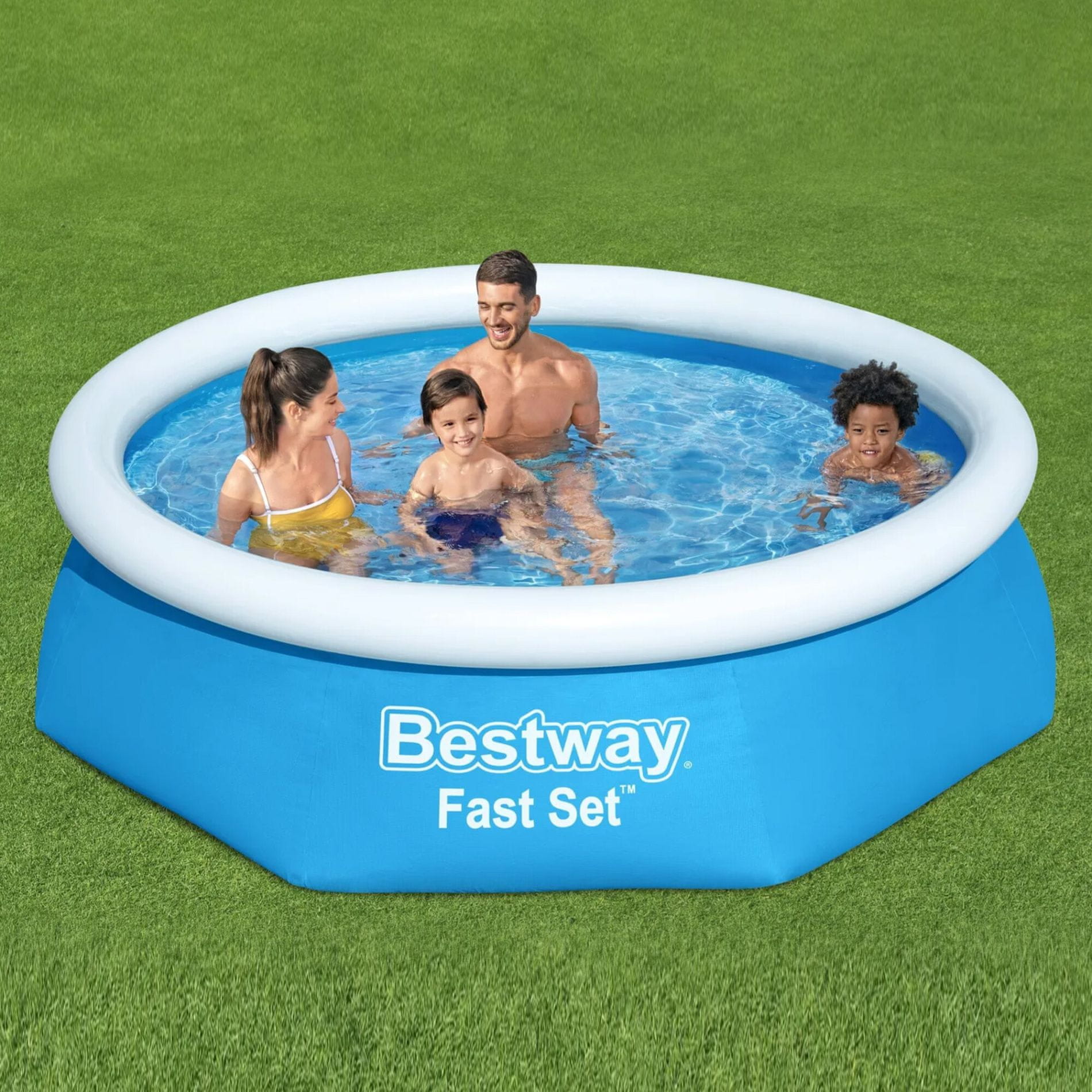 Nadzemni okrogli družinski vrtni bazen, od italijanskega podjetja Bestway.Bazén je samonosni, samo napihnite zgornji obroč in bazen napolnite z vodo. Naraščajoči stolpec vode bazen sam postavi. Celoten opis
