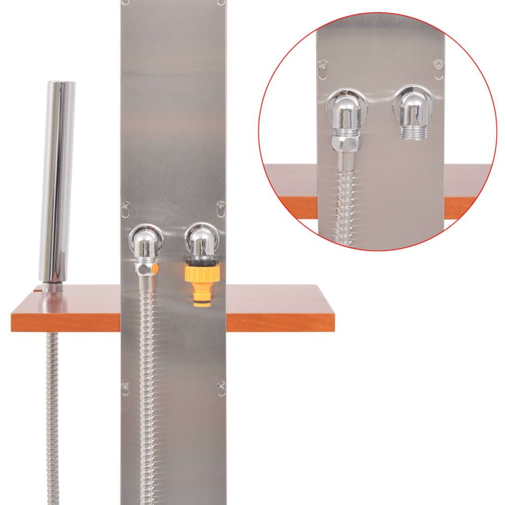 Vrtna prha je opremljena z leseno polico in ventilom za priročno preklapljanje med dvema tušema. Priložena je tudi 1,5 m dovodna cev za ročni tuš. Kovinski navojni priključek in priloženi rumeni Gardena adapter omogočata, da lahko ta zunanji tuš na 2 načina povežete z vrtno cevjo. Tuš je izdelan iz brušenega nerjavečega jekla in lesene osnove, zato je zelo trpežen.