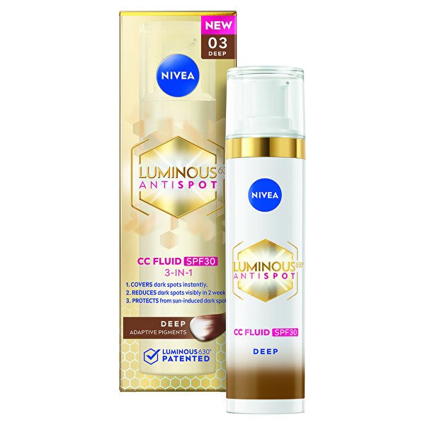 Sijoča in naravno enotna koža vsak dan? Preizkusite kremo LUMINOUS630® CC. Zahvaljujoč OF 30 je idealen partner za prekrivanje kožnih nepravilnosti in zaščito pred škodljivim sončnim sevanjem. Vsebuje patentirano snov LUMINOUS630®, ki zmanjša temne madeže in tako poenoti ten kože. Barvni pigmenti se prilagodijo tenu kože in prekrijejo pigmentne madeže ter druge nepravilnosti, ki se pojavijo na koži.