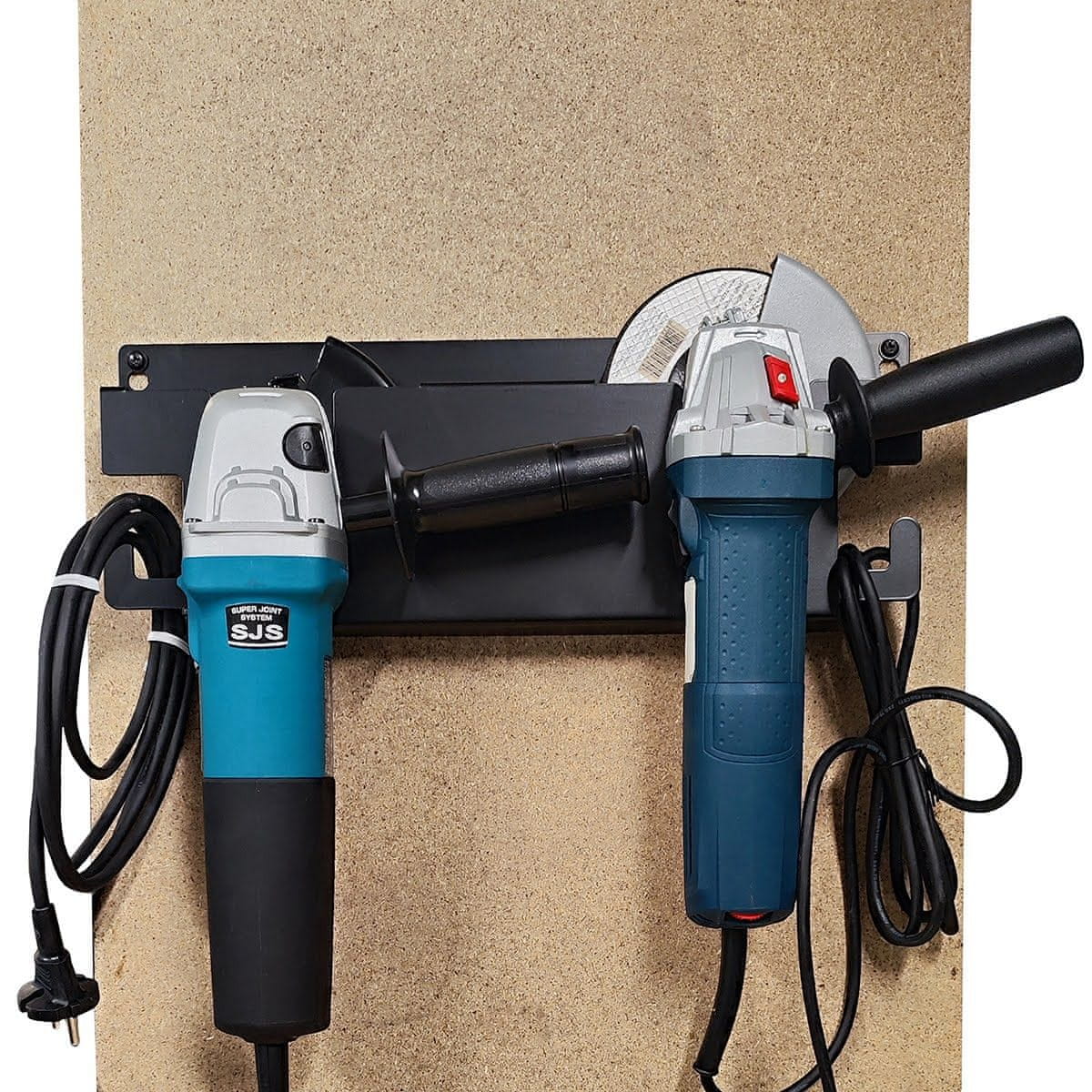 Dvojni stenski obešalnik GLOB TOOLS za kotni brusilnik je funkcionalen nosilec za varno shranjevanje dveh 125 mm kotnih brusilnikov.