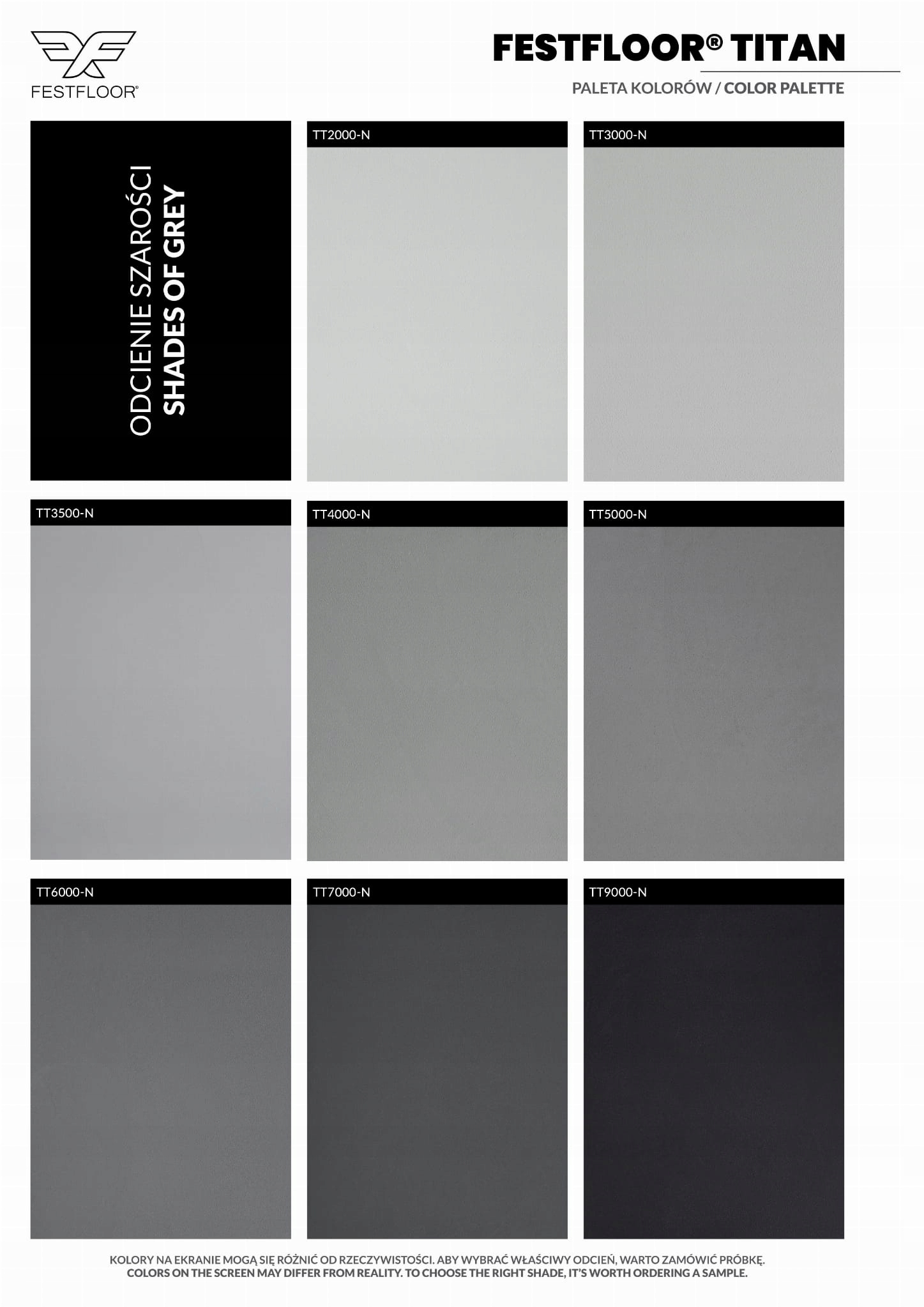 Oglejte si standardno barvno karto mikrocementa FESTFLOOR TITAN in izberite pravo barvo za svoj projekt. Barve na zaslonu se lahko razlikujejo od dejanskega stanja. Za izbiro pravega odtenka priporočamo, da naročite vzorec.