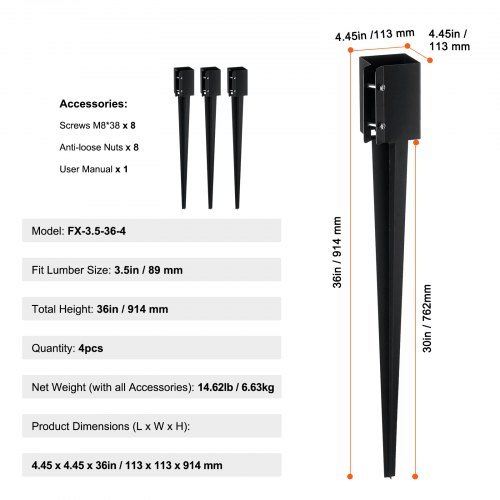 VEVOR Nosilec za ograjo zemeljski klin 113x113x915 mm črni kovinski