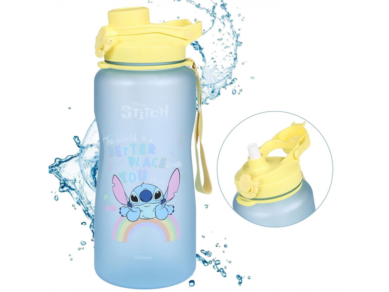 Velika plastična steklenica z motivom Andzie in Stitcha in kapaciteto 2,3 litra je idealna za ljubitelje Disneyjevih risank. Modra steklenica z rumenim pokrovčkom je opremljena s priročnim izlivom in vrvico, ki omogoča lažje nošenje. Na steklenici je natisnjena mililitrska lestvica, ki omogoča natan Celoten opis