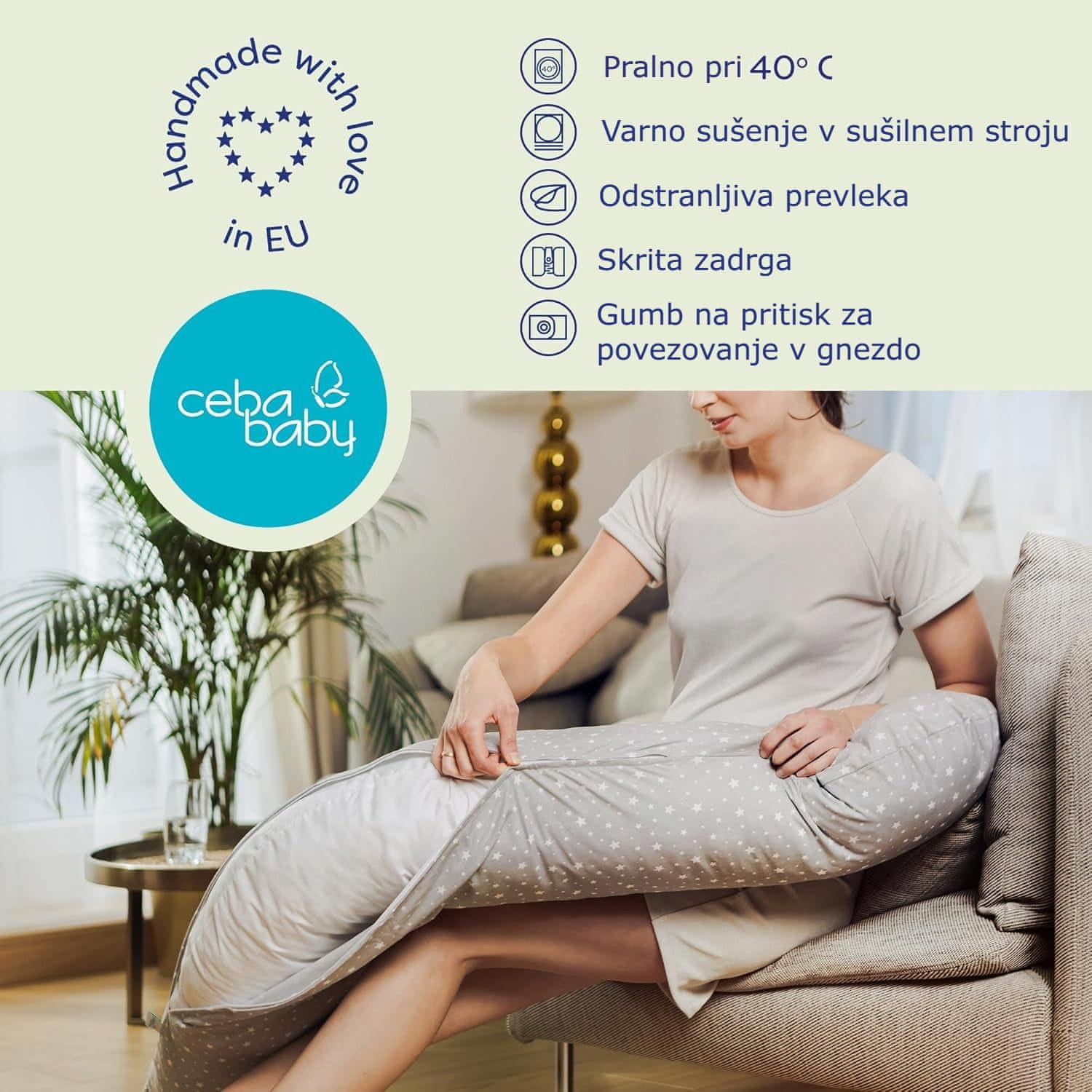 Multifunkcionalna materinska blazina znamke Ceba baby je namenjena za spanje, hranjenje in oporo tako mamicam, očetom in majhnim dojenčkom. Blazina je polnjena z majhnimi kroglicami – stiropor mikro-biser, ki se običajno uporablja v rehabilitacijskih blazinah. Zahvaljujoč svojim lastnostim mikrobiser omogoča telesu, da zavzame udoben položaj in razbremeni hrbtenico. Blazina je kot nalašč za zadnje mesece nosečnosti, dojenje dojenčka, pa tudi za kasnejši proces učenja sedenja, da zagotovi trdno oporo dojenčku.