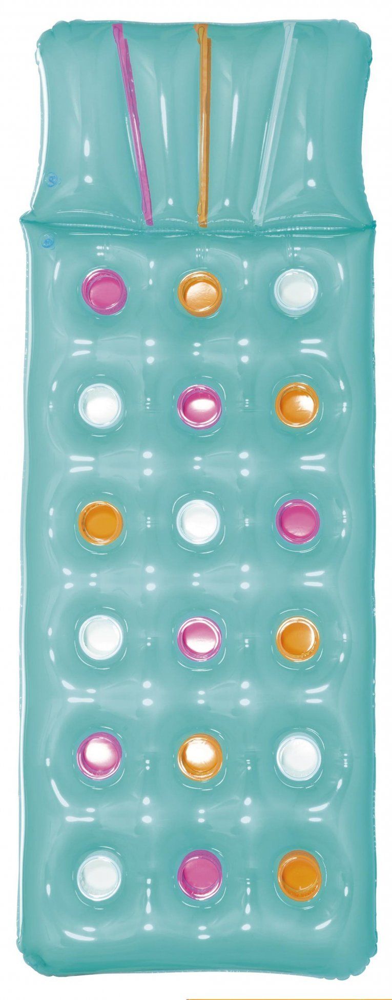Napihljivi ležalnik z 18 žepi ima ločeno napihljivo blazino in del za ležanje, kar zagotavlja večje udobje. Ko je napihnjen, meri 188 × 71 cm, zato je zelo priljubljen model. Ležalnik je na voljo v privlačni turkizni barvi. Opozorilo: Pred uporabo ležalnika se prepričajte, da je podlaga gladka in brez ostrih predmetov, kot so kamenčki ali vejice, ki bi lahko poškodovali ležalnik.