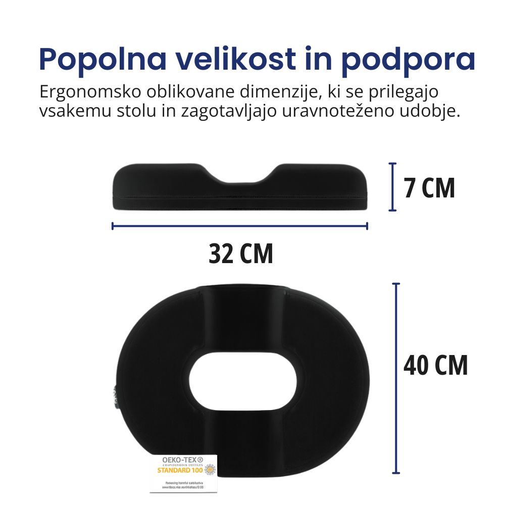 Ergonomska oblika z izrezom zmanjšuje pritisk na trtico in križ, medtem ko spominska pena poskrbi za optimalno podporo in udobje. Snemljiva prevleka omogoča enostavno čiščenje in dolgo življenjsko dobo izdelka.
