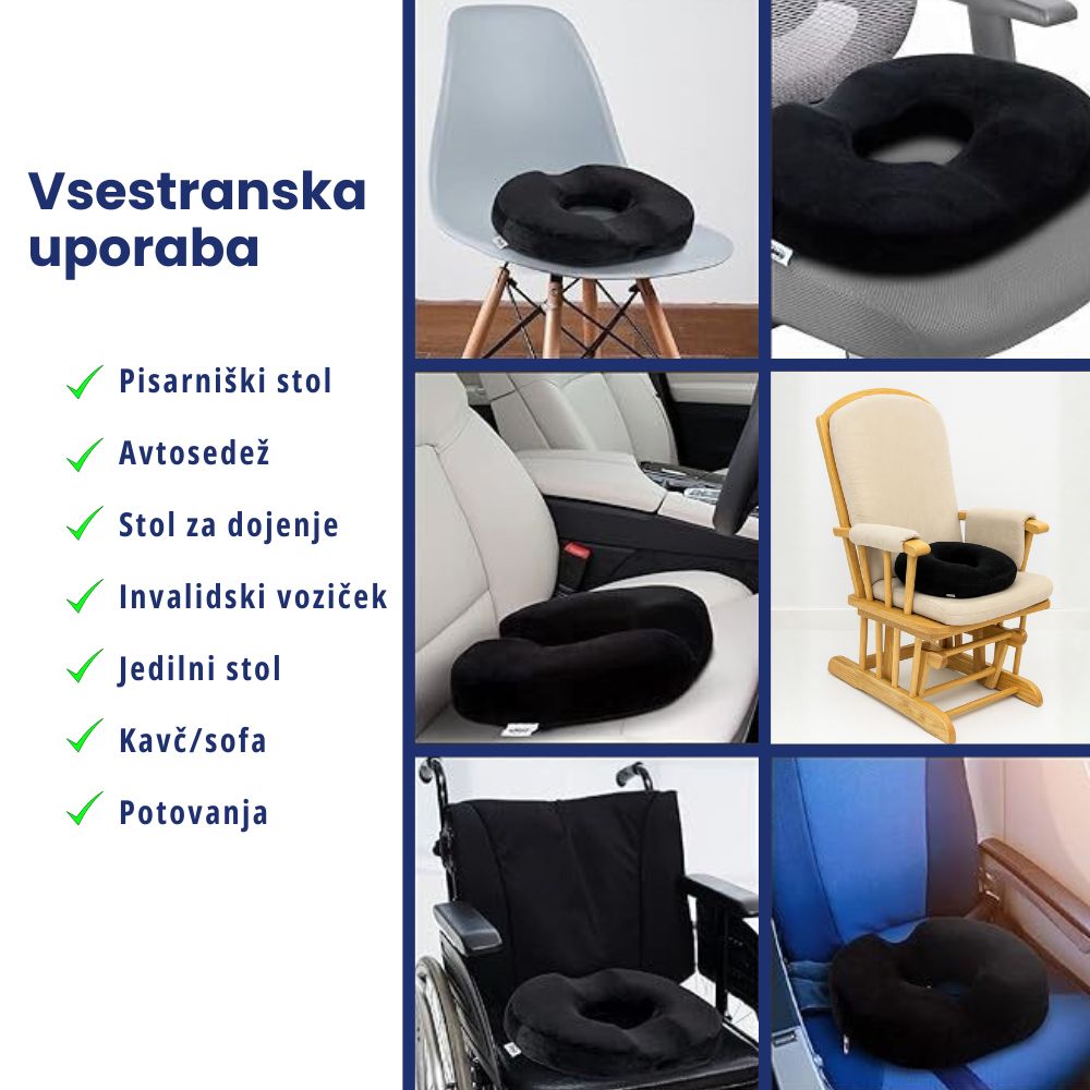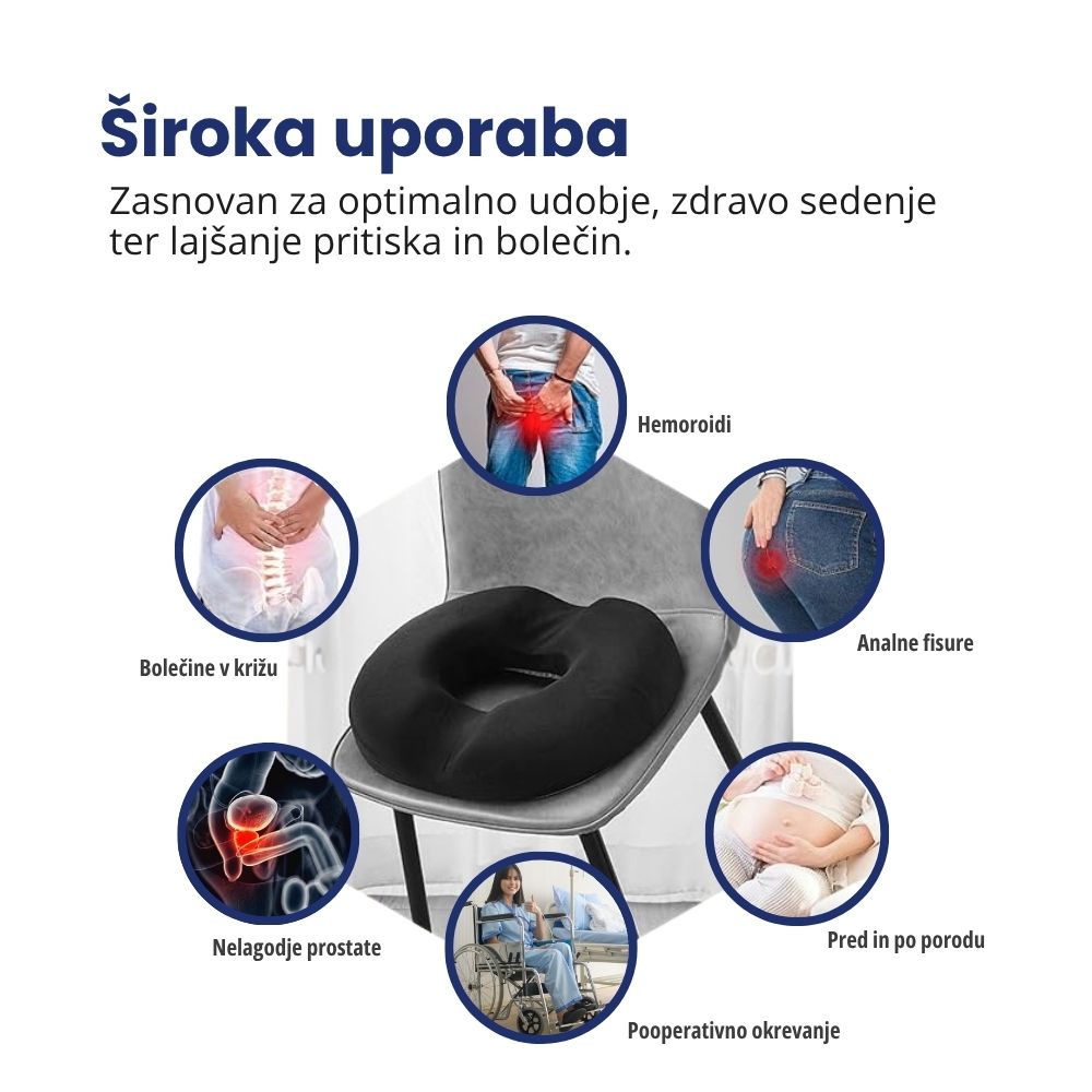 Olajša sedenje pri hemoroidih, bolečinah v križu, nelagodju prostate, pred in po porodu ter med pooperativnim okrevanjem. Zmanjšuje pritisk na občutljiva področja in pomaga preprečevati dodatne bolečine