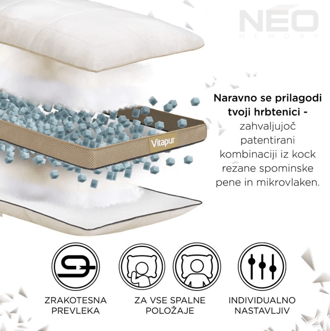 Tukaj je! Vzglavnik NEO, ki se popolnoma prilagaja Vam! Vaš položaj telesa med spanjem je zelo pomemben pri izbiri vzglavnika. Če je vaš vzglavnik prenizek ali previsok, so lahko bolečine v vratu vaša stalnica. Z NEO Bamboo Memory si lahko idealno prilagodite višino in trdoto vzglavnika. Polnilo lahko enostavno dodajate/odvzemate in si oblikujete vzglavnik po svojih željah, da bosta vaša hrbtenica in vrat vedno v pravilni legi.