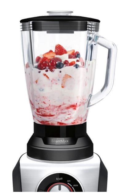 Zmogljivi blender Bosch MMB64G3M z 800 W motorjem se pohvali z Noise Reduction sistemom za izjemno tiho delovanje. Odlikuje ga mešalni vrč iz termo stekla s prostornino 2,3 l (1,5 l s hrano). Izbirate lahko med 3 avtomatskimi programi. Omogočena je brezstopenjska regulacija vrtljajev. Priložen ima sekljalnik in filter za pripravo napitkov brez pečk. Celoten opis
