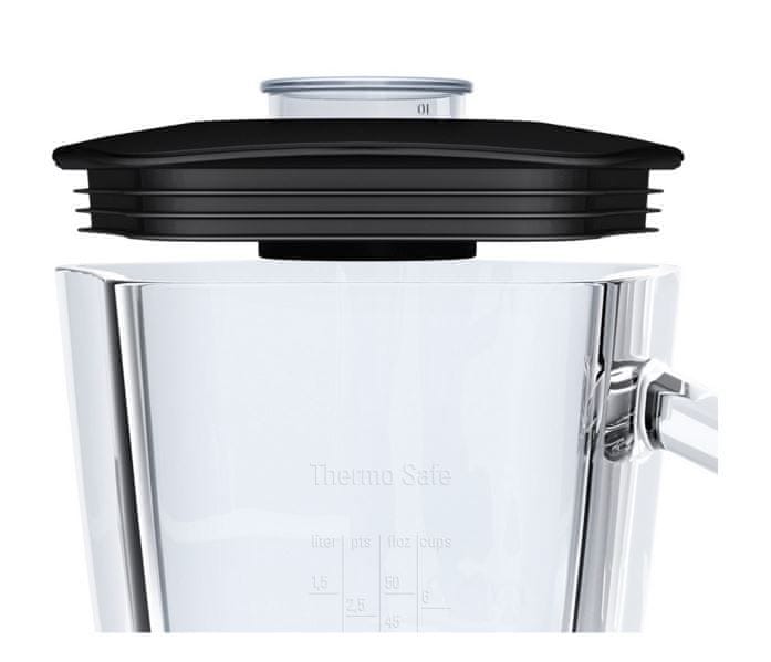 Prednost blenderja je kakovostno ThermoSafe steklo mešalnega vrča, ki zagotavlja varno pripravo tako vroče juhe kot hladnih napitkov. Navdušeni boste nad filtrom za ločevanje pečk ter sekljalnikom, ki bo poskrbel za hitro, udobno sekljanje čebule, zelišč, začimb itd. Idealen je tudi za drobljenje ledu.