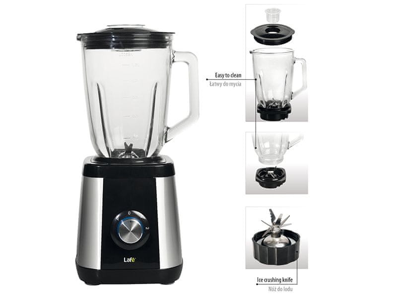 Blender Lafe BCP003 se ponaša s 600 W moči in dvema stopnjama hitrosti mešanja ter načinom pulziranja. Ima stekleno mešalno posodo s prostornino 1,5 litra. Celoten opis
