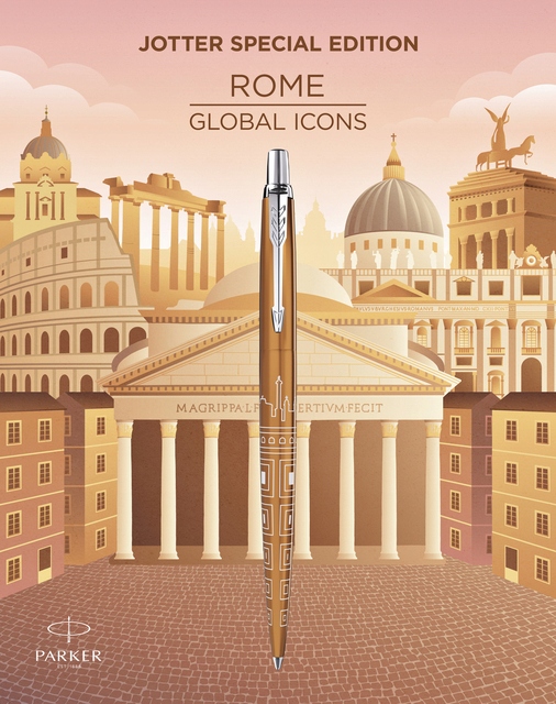 Najnovejša kolekcija Jotter Special Edition črpa navdih iz mest po vsem svetu. To pisalo Global Icons ujame energijo in značaj mesta Rima. Dizajn, ki prikazuje mestno obzorje, katerega zapletene ulice ustvarjajo edinstvene vzorce, je lasersko vgraviran na rjavo ohišje pisala Jotter Special Edition Rome.