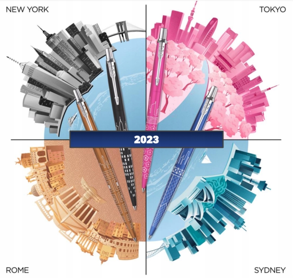 Vsako posebno pisalo, ki črpa navdih iz vsakega od štirih kotičkov sveta, je posvečeno določenemu mestu – vsak zaključek pripoveduje zgodbo o njegovi arhitekturi, kulturi in ljudeh. Z združitvijo teh zgodb v dizajn enega samega pisala nova kolekcija Jotter vsak dan spremeni v izjemno pustolovščino.