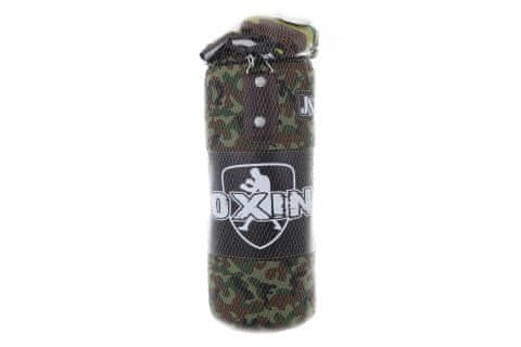Boksarska vreča velikosti približno 55 × 28 × 20 cm z verigo za obešanje in dve boksarski rokavici velikosti približno 21 cm. Pakirano v mrežo. Starost 3+