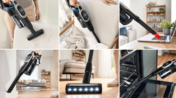 Vključuje sesalnik, baterija, nastavek za oblazinjeno pohištvo, dolga prilagodljiva šoba za čiščenje špranj, nastavek za čiščenje tipkovnic in predalov, šoba za čiščenje špranj, XXL nastavek za oblazinjeno pohištvo