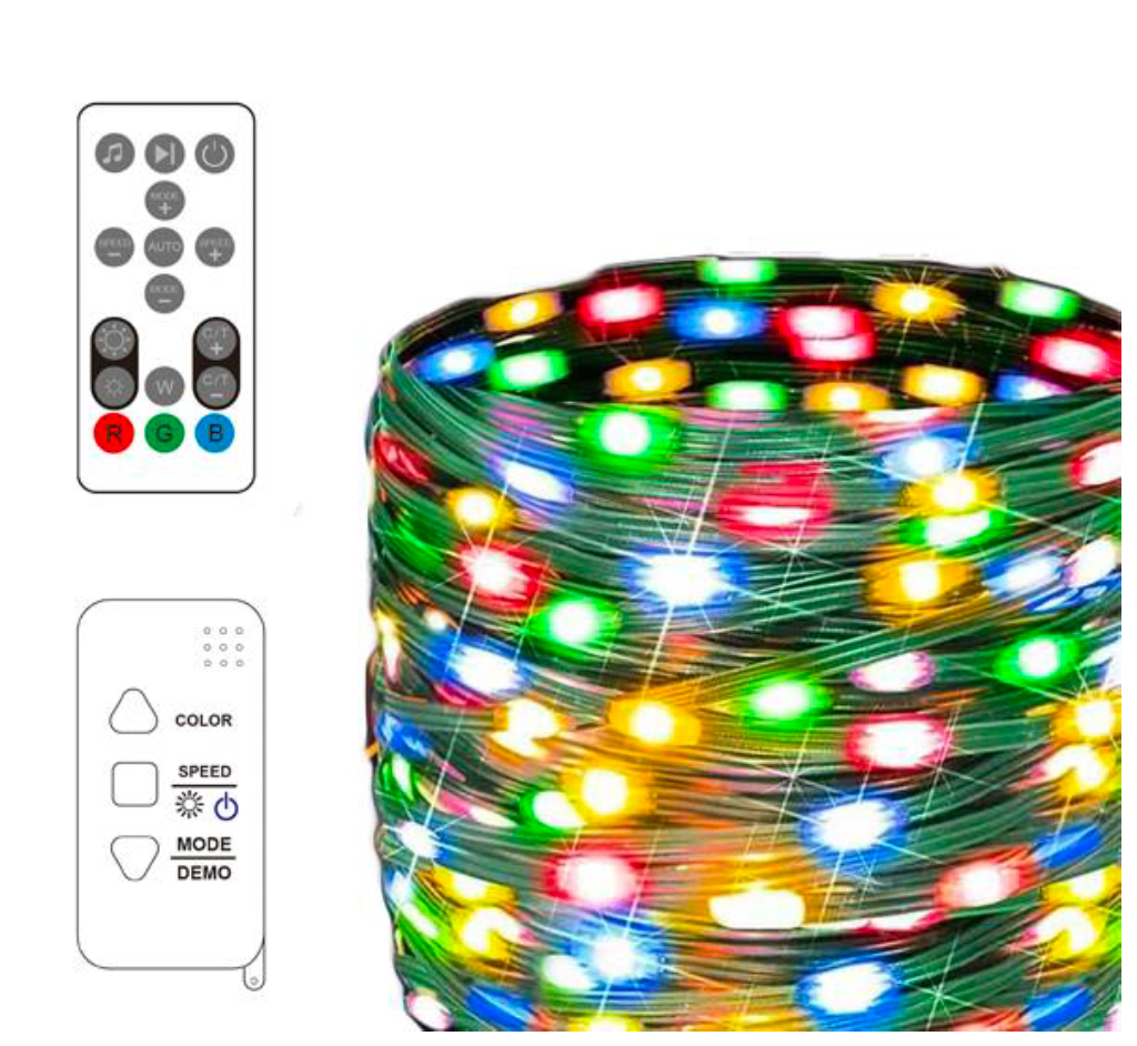 Ta pametna svetlobna veriga LED je pravi dodatek za vsak sodoben dom! Z dolžino 10 m in osvetlitvijo RGB zagotavlja široko paleto možnosti za okrasitev vseh zunanjih ali notranjih prostorov. Zaradi zelene barve kabla se na primer popolnoma zlije z božičnim drevescem. Zaščita IP67 omogoča tudi uporabo na prostem. Zelena barva kabla se odlično prilega zunanjim lončnicam in okraskom, kjer bo kabel skoraj neviden. Veriga je opremljena s funkcijama WiFi in Bluetooth, ki omogočata enostavno upravljanje prek mobilne aplikacije Smart Life / Tuya Smart. Priložen je daljinski upravljalnik, zato vam ni treba vstati s kavča, da bi spremenili barvo ali intenzivnost svetlobe. Veriga je primerna za notranjo in zunanjo uporabo
