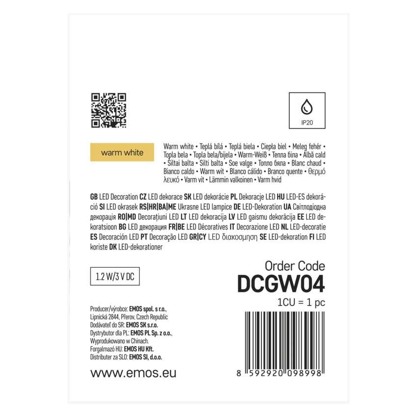 izdelek: okrasna kita • barva svetlobe: topla bela • dimenzije: 170 cm • uporaba: notranja • programska ura: ne • daljinski upravljalnik: ne • tip napajanja: baterija 2× AA (ni priloženo) • število LED: 20 • dolžina dovoda: 0,3 m • prihodna moč: 1,2 W • izhodna napetost: 3 V DC • zaščita: IP20 Celoten opis