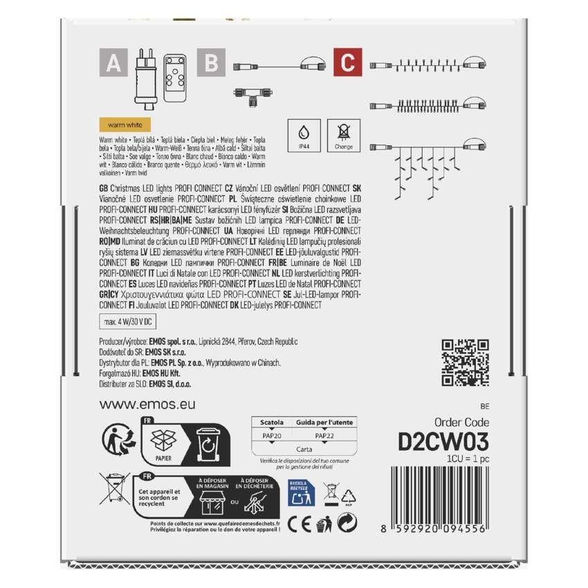 izdelek: kapniki • barva svetlobe: topla bela • dimenzije: 3 × 0,4 m • uporaba: zunanja in notranja • daljinski upravljalnik: ne • funkcije: sveti/utripa • tip napajanja: omrežni adapter (ni priloženo) • oblika: klasičen • število LED: 50 • dolžina dovoda: 10 cm • barva žice: črna • zaščita: IP44 Celoten opis