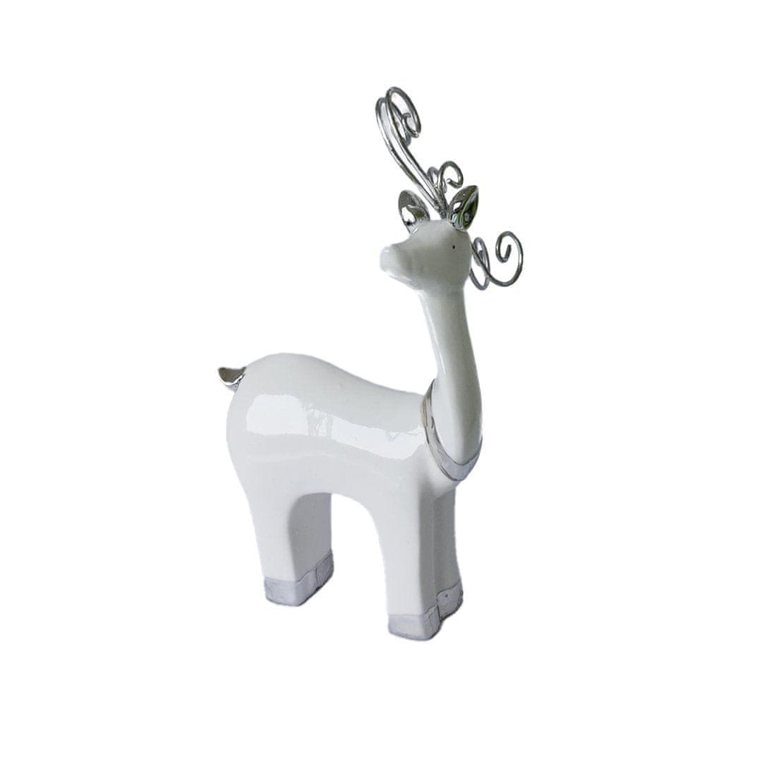 Dekorativni okras ponosno gledajočega belega jelena s srebrnimi poudarki je lahko čudovit del praznične okrasitve. Izdelan je iz porcelana s srebrnimi poliranimi zaključki. V višino meri 24 cm v širino pa 13 cm. Celoten opis