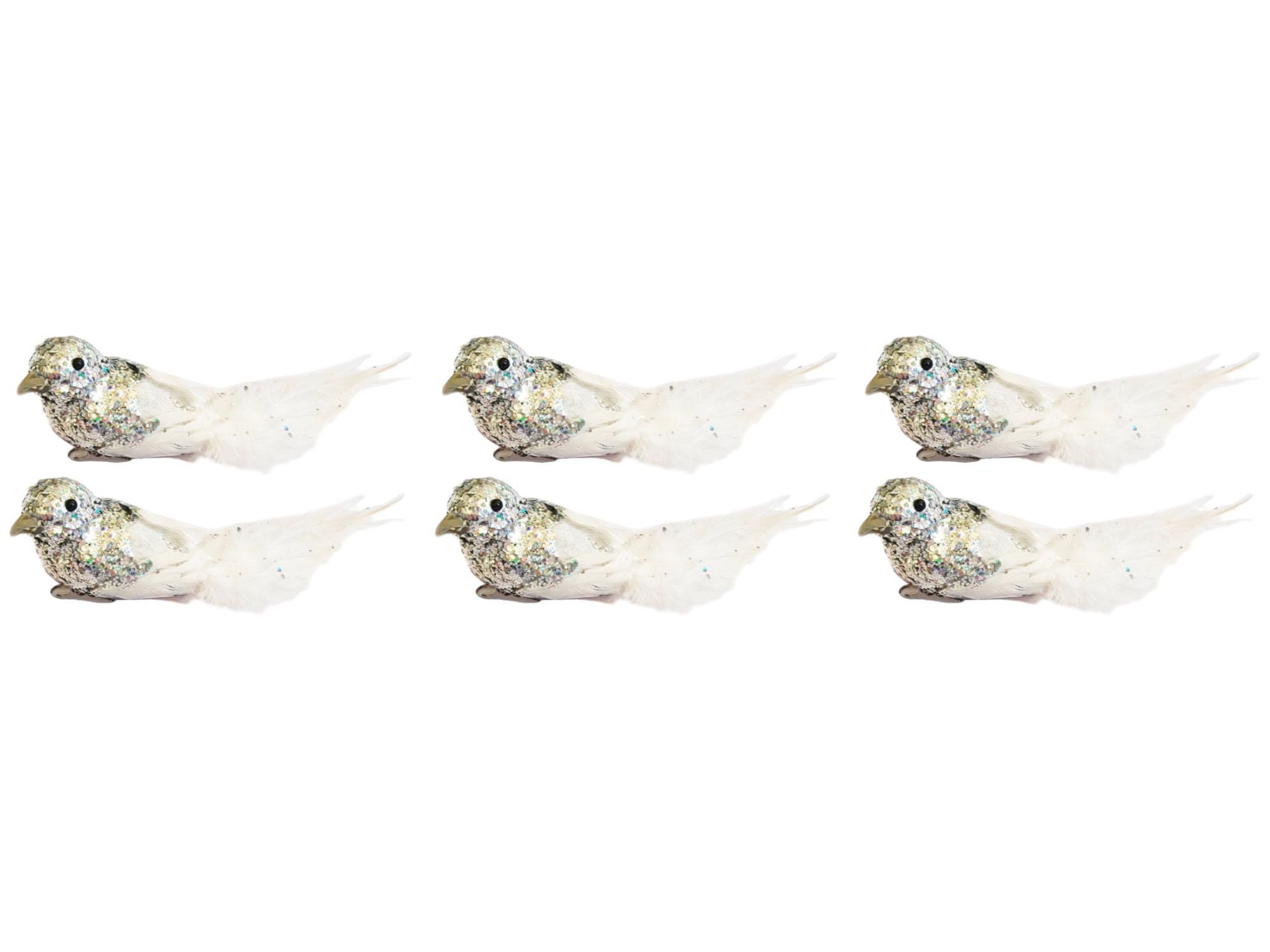 Komplet 6 ptičjih okraskov z belim perjem in srebrnimi bleščicami.