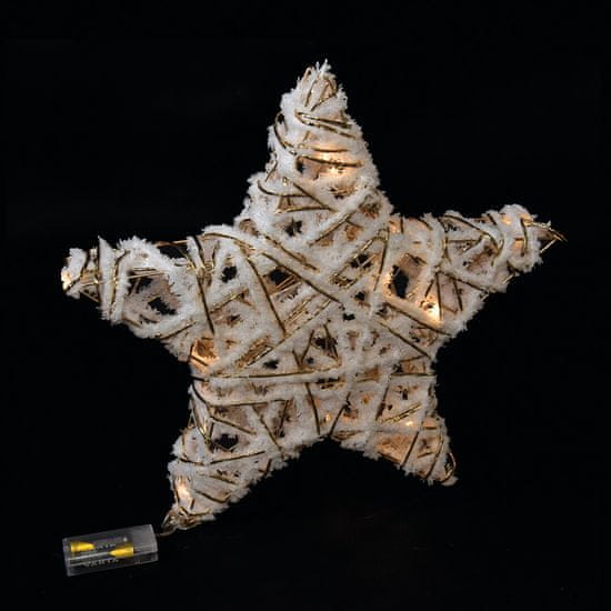 Novoletno drevesce v obliki zvezde s pozlačenim ogrodjem in elegantno belo-zlato okrasitvijo prinaša pridih praznične elegance v vsak prostor. Opremljeno je z 10 LED lučkami, ki oddajajo toplo belo svetlobo, kar ustvarja prijetno in nežno svetlobno atmosfero. Drevesce deluje na baterije 2×AA (niso priložene), kar omogoča enostavno postavitev kjerkoli v vašem domu, ne da bi vas omejevali kabli. Idealno je za popestritev praznične dekoracije, bodisi kot osrednji okras na mizi ali kot subtilen dodatek v kotičku sobe.
