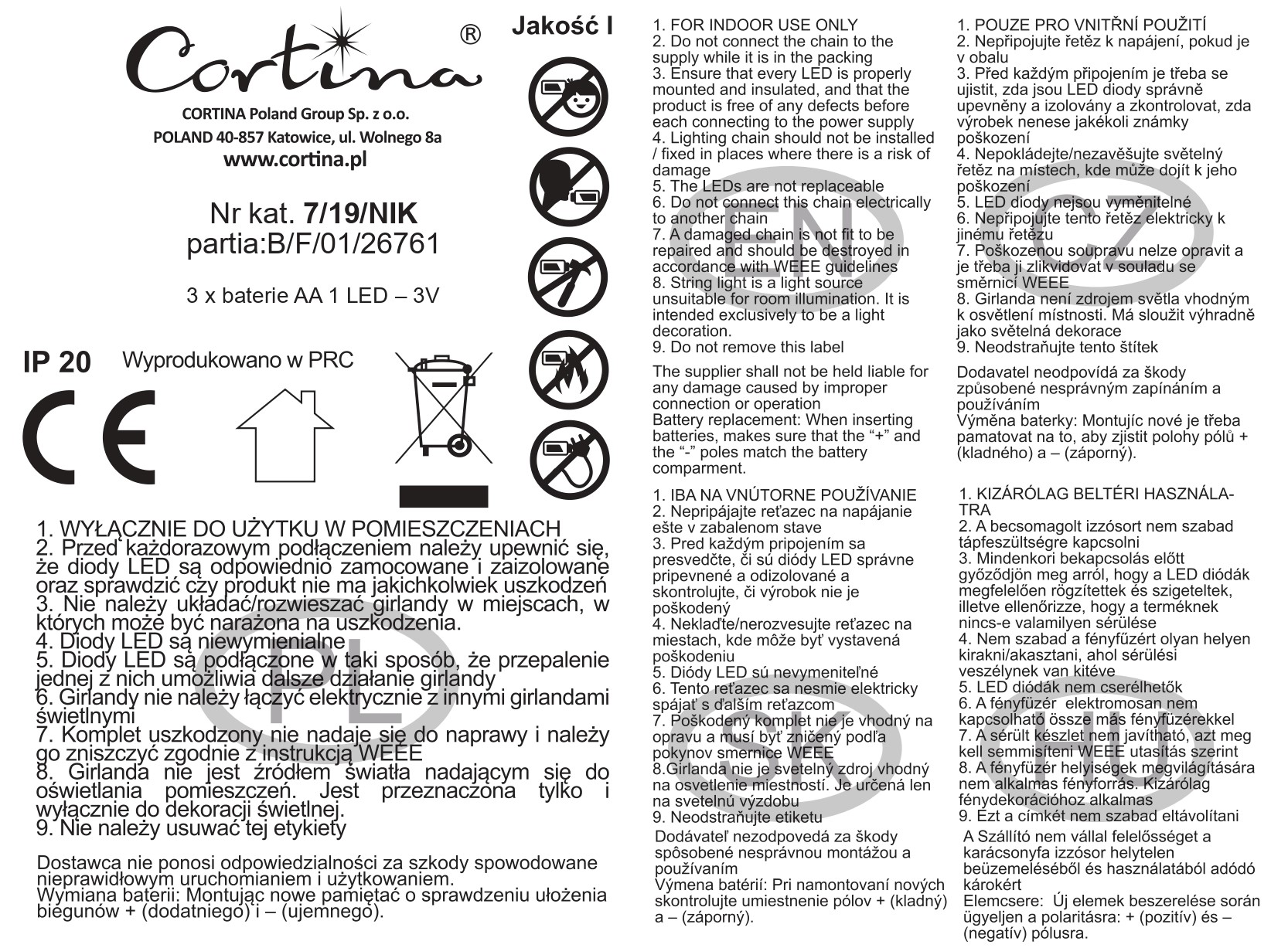 | Naslov subjekta, ki uvaja izdelek na trg | Ime podjetja: cortina poland group sp. z o.o. Ulica in hišna številka: wolny 8a Poštna številka in mesto: 40–857 katowice pl |
