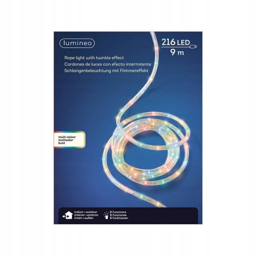 9 m pisane božične lučke. Te božične lučke so idealne tako za notranjo kot zunanjo božično drevesce. Te božične lučke imajo zaščito IP44, kar pomeni, da so primerne tudi za zunanjo dekoracijo. Dolžina vrvice je idealna za okrasitev srednje velikih površin in božičnih drevesc. Značilnosti: Barva kabla: bela. Za notranjo in zunanjo uporabo. Zaščita IP: IP44. Barva LED diode: barvita. Število žarnic: 216. Dolžina svetlobe: 9 m.