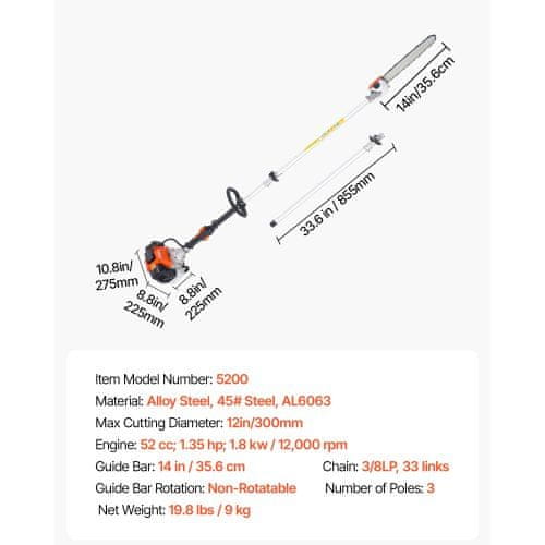 Ta gaasitoitel varresaag on ideaalne kõrgete okste hõlpsaks kärpimiseks ja pügamiseks. Selle juhtmevaba disain ja reguleeritav ulatus muudavad selle ideaalseks õuealade kujundamiseks ja puude hoolduseks. Mõõtmed: 275×225×225 mm. Celoten opis