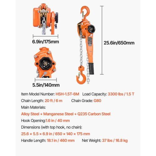 VEVOR Ročni verižni dvigalo HSH-1.5T-6M 650x140x175 mm 6 m 1500 kg